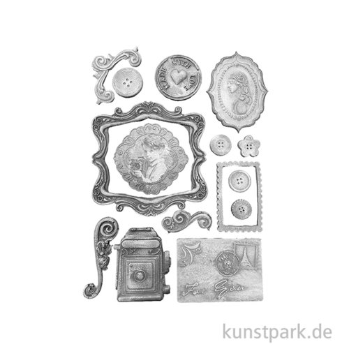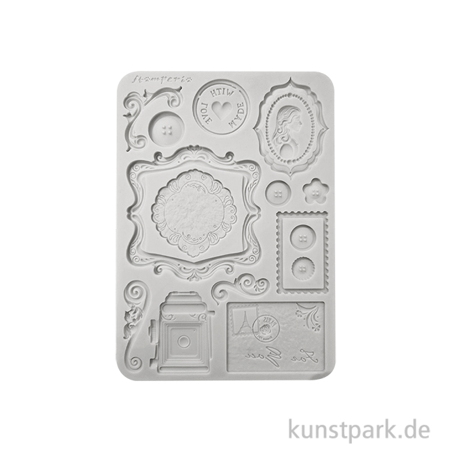 Eine flexible Silikonform mit romantischen Vintage Designs. Du kannst die einzelnen Motive dreidimensional ausgießen oder in eine Modelliermasse hinein prägen. Die Form ist für diverse Gieß- und Modelliertechniken geeignet.