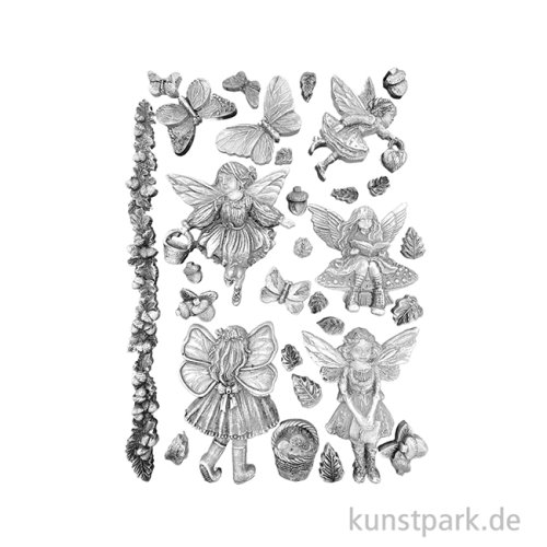 Eine flexible Silikonform mit zauberhaften Fee Designs. Du kannst die einzelnen Motive dreidimensional ausgießen oder in eine Modelliermasse hinein prägen. Die Form ist für diverse Gieß- und Modelliertechniken geeignet.