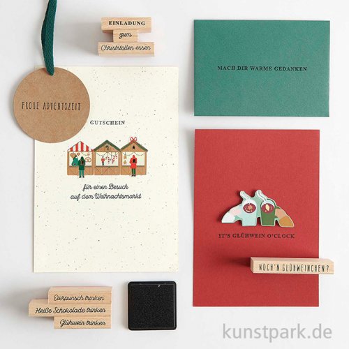 Stempelset - Weihnachtsmarkt Texte, 20 Holzstempel + Stempelkissen