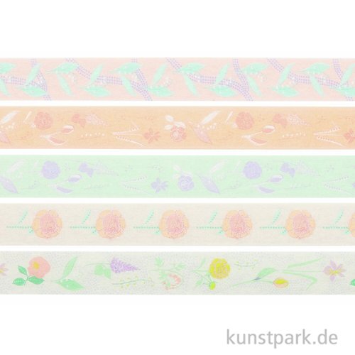 5 florale Washi Tapes mit verschiedenen Motiven im Set. Die Deko Klebebänder sind mit glänzenden Hot Foil Akzenten veredelt. Ideal zum Verzieren von Karten, Geschenken, Scrapbooks und Journals. Jede Rolle Tape ist 15 mm breit und 10 Meter lang.