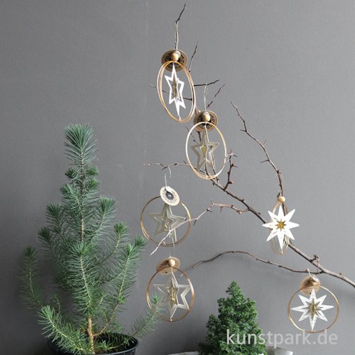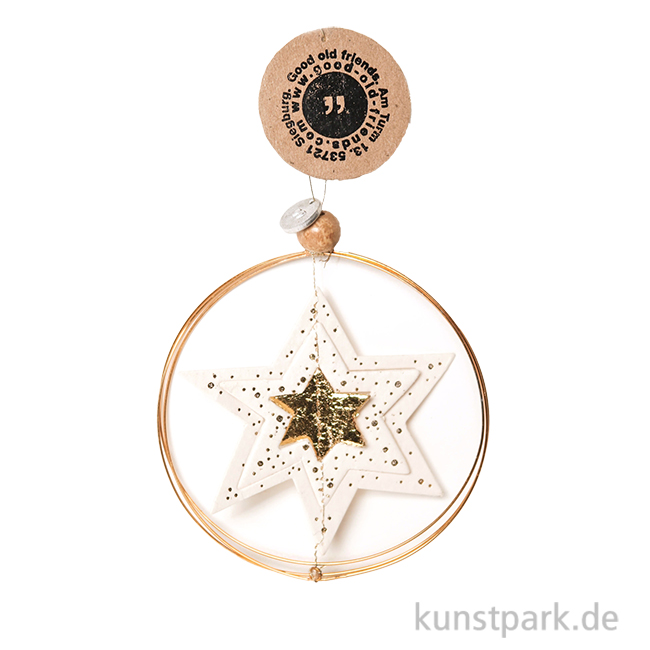 Ein eleganter Winterkranz aus goldenem Draht, geschmückt mit einem festlichen Stern aus bedruckter Pappe, einer Holzkugel und einem Papieranhänger. Er verschönert Äste, Fenster und vieles mehr. Ein bezauberndes Kunsthandwerk Unikat von goold old friends.