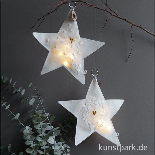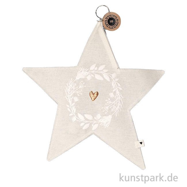 Ein festlicher Stern aus Baumwollstoff mit Druck und Stickerei. Er lässt sich wunderbar beleuchten – dank dem Reißverschluß zum Einlegen einer Lichterkette. Inklusive Metallring zum Aufhängen. Ein bezauberndes Kunsthandwerk Unikat von goold old friends.