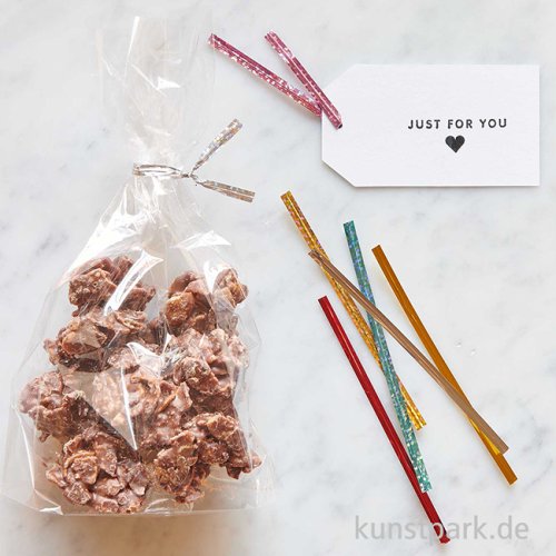 Setze Akzente mit unseren farbenfrohen Verschlussbändern. Eine Packung enthält 50 Stück. So kannst Du Geschenke zu jedem Anlass stilvoll und einladend verpacken. Mach Deine Geschenktüten zum Highlight!